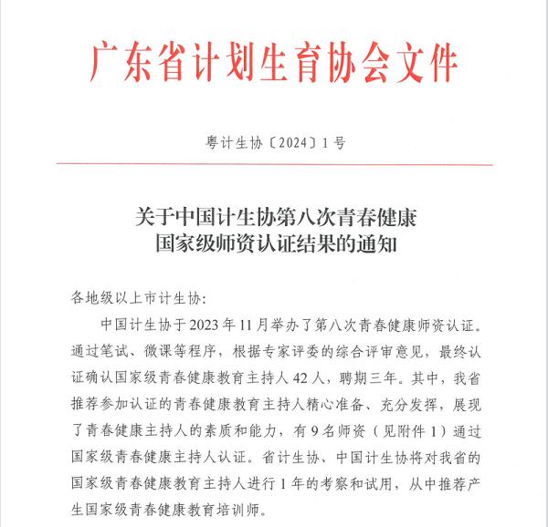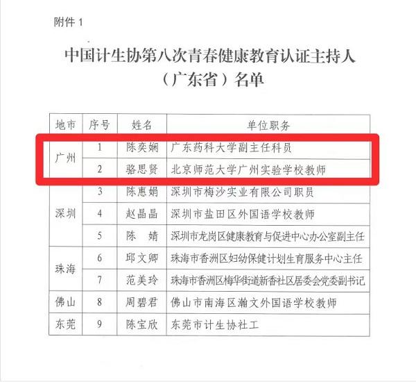 中國(guó)計(jì)生協(xié)于2023年11月舉辦了第八次青春健康師資認(rèn)證。通過(guò)筆試、微課等程序,根據(jù)專(zhuān)家評(píng)委的綜合評(píng)審意見(jiàn),我市計(jì)生協(xié)選送的陳奕嫻(番禺區(qū))、駱?biāo)假t(黃埔區(qū))兩名師資從全國(guó)90名參加認(rèn)證的師資中脫穎而出,順利通過(guò)中國(guó)計(jì)生協(xié)青春健康國(guó)家級(jí)師資認(rèn)證,為我市青春健康工作注入新動(dòng)能,再添新亮色。