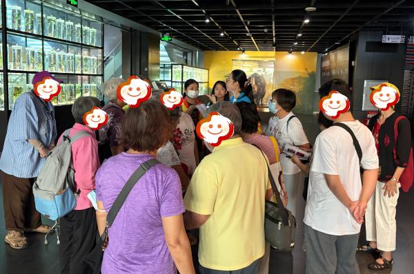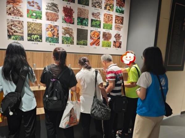 出發(fā)前,社工為參與者分發(fā)了中藥知識(shí)小卡片,鼓勵(lì)大家在參觀中隨時(shí)對(duì)照學(xué)習(xí)。走進(jìn)博物館,中庭大型液浸標(biāo)本展區(qū)首先映入眼簾——兩側(cè)標(biāo)本墻拔地而起,六百多瓶藥材靜置其中,猶如一座“中藥水晶宮”。參與者紛紛舉起手機(jī)拍攝,感嘆中草藥種類的豐富。