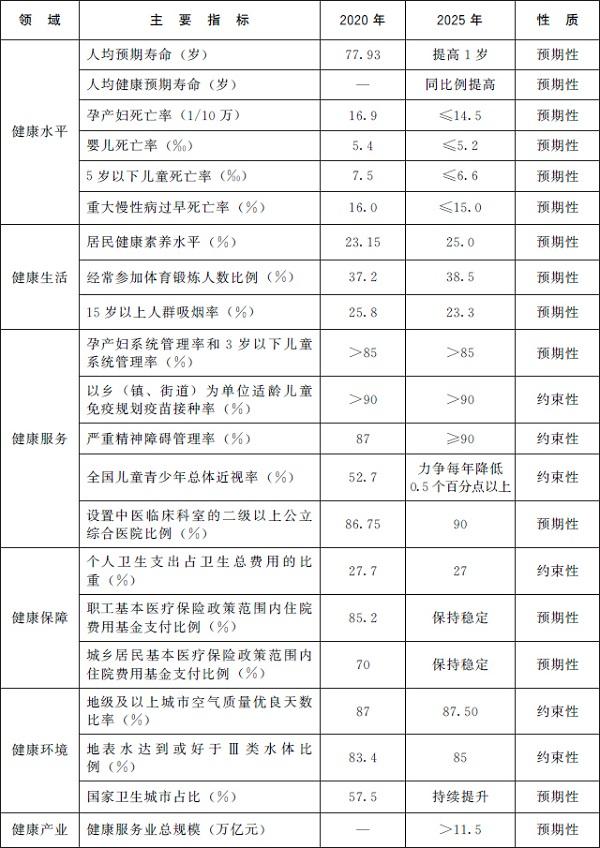 (三)發(fā)展目標(biāo)。到2025年,衛(wèi)生健康體系更加完善,中國特色基本醫(yī)療衛(wèi)生制度逐步健全,重大疫情和突發(fā)公共衛(wèi)生事件防控應(yīng)對能力顯著提升,中醫(yī)藥獨(dú)特優(yōu)勢進(jìn)一步發(fā)揮,健康科技創(chuàng)新能力明顯增強(qiáng),人均預(yù)期壽命在2020年基礎(chǔ)上繼續(xù)提高1歲左右,人均健康預(yù)期壽命同比例提高。
