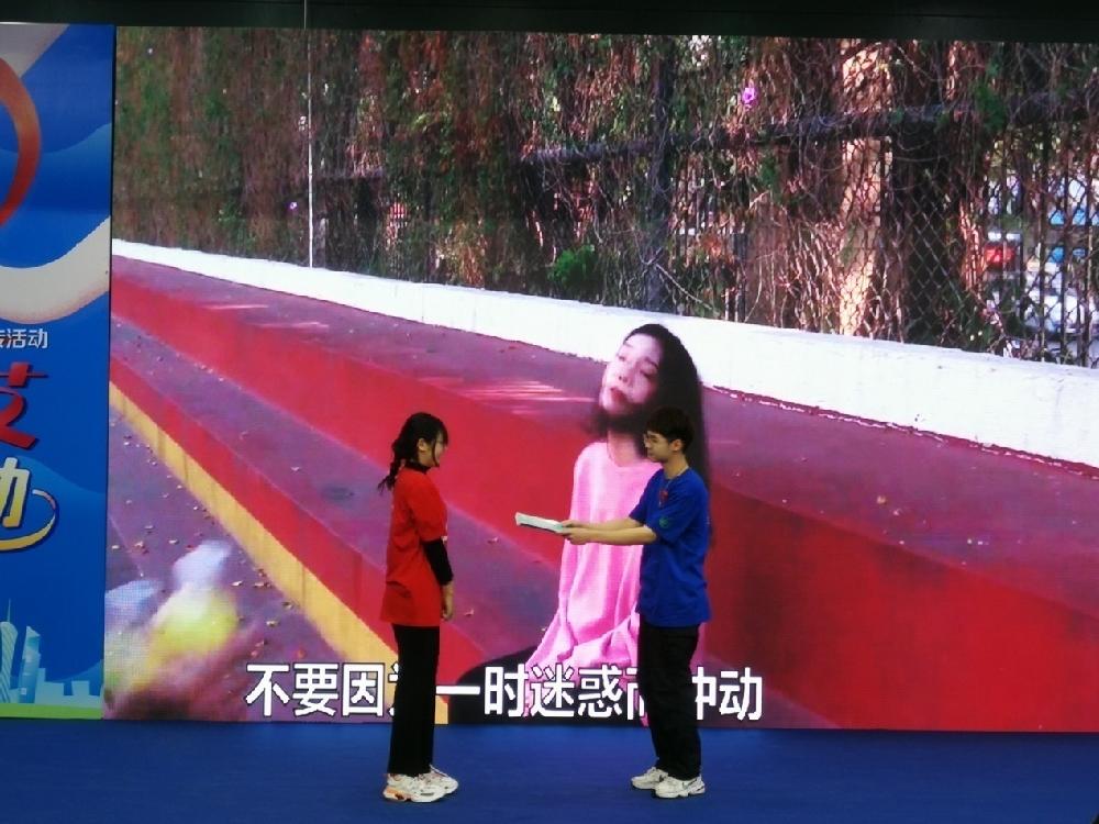 活動現(xiàn)場推出了青少年在線風(fēng)險評估小程序“熊探”和廣東青少年性健康友好服務(wù)平臺,拉開了廣東省暨廣州市艾滋病檢測咨詢月宣傳活動序幕。報告廳內(nèi),廣東外語藝術(shù)職業(yè)學(xué)院的同學(xué)們代表廣州市計生協(xié)表演了青春歌舞。同學(xué)們以情景表演的形式演繹了原創(chuàng)歌曲——小心“愛”?!昂孟敫阏勔粓鎏鹛鸬膽賽?,好想跟你談一場不一樣的戀愛,但是不要因為一時迷惑而沖動,你還有大把美好的未來......”,清新明麗的歌聲、全情投入的表演,表達(dá)了大學(xué)生對美好愛情的向往與追求,倡議大家要愛不要“艾”,要做健康、安全、負(fù)責(zé)任的決定。音樂響起,燈光炫起、掌聲雷起,“做個更好的自己,改變就從現(xiàn)在起”!鏗鏘有力的口號聲、嫻熟流暢的肢體動作,廣外藝的青春使者們輕捷的舞步、四射的激情、伴著強(qiáng)勁的節(jié)奏,舞動著自己、舞動著青春、舞動著紅絲帶。同學(xué)們自信的笑容、靈動的舞姿,不僅顯示了他們遏制艾滋的信心與決心,也展示了生命之舞的青春活力與獨特魅力,活動在充滿動感的旋律中落下帷幕。
