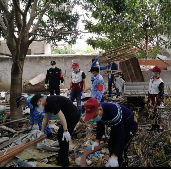 【周偉禮(正中間戴紅色鴨舌帽)帶領(lǐng)社區(qū)男同事清理小區(qū)垃圾】