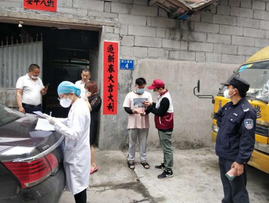 【溫海鷹(右一)協(xié)同三人入戶小分隊為湖北返穗人員登記】