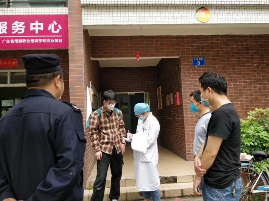 【溫海鷹(右二戴紅色鴨舌帽)正在指導(dǎo)湖北籍返穗人員進(jìn)行個人健康申報】