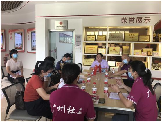 李益平(正中間)認(rèn)真聽取社工介紹穗東街社工服務(wù)站工作開展情況