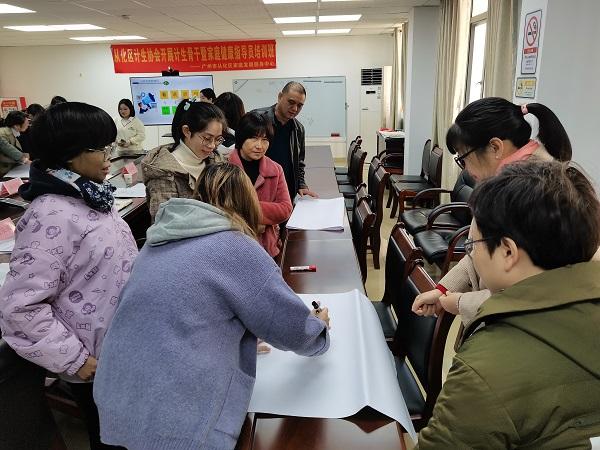 家庭健康指導員培訓主要圍繞家庭健康指導技能和家庭生活健康指導內(nèi)容開展,通過知識講解、互動回答、小組討論、情景模擬等方式進行參與式培訓。