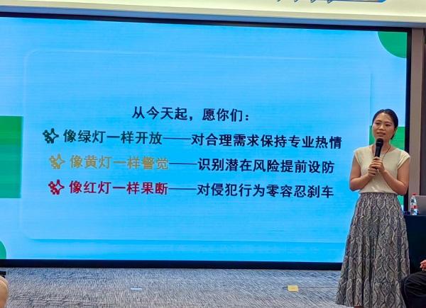 劉國(guó)萍老師打破傳統(tǒng)講授方式,采用情景模擬教學(xué),引導(dǎo)員工代入不同角色,親身體驗(yàn)服務(wù)流程,共同識(shí)別人際交往中的潛在風(fēng)險(xiǎn)?,F(xiàn)場(chǎng)互動(dòng)積極,員工結(jié)合自身經(jīng)歷踴躍分享應(yīng)對(duì)技巧。以此為基礎(chǔ),劉老師介紹了職場(chǎng)社交的“信號(hào)燈”法則:綠燈行為代表安全、得體的互動(dòng);黃燈行為警示風(fēng)險(xiǎn)初現(xiàn)、需提高警覺(jué);紅燈行為則明確標(biāo)識(shí)侵犯與傷害、必須堅(jiān)決阻斷。面對(duì)紅燈行為,她重點(diǎn)講解了“三呼救法”——中斷接觸、脫離環(huán)境、上報(bào)支援,并強(qiáng)調(diào)借助安全工具與法律手段自我保護(hù)。