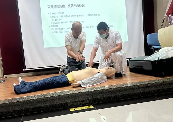 在實(shí)操環(huán)節(jié),該院急診科主治醫(yī)師鐘智成醫(yī)生利用模擬人等專業(yè)教具,分步演示了心肺復(fù)蘇的操作流程,包括判斷意識與呼吸、調(diào)整體位、實(shí)施胸外按壓、開放氣道及人工呼吸等。鐘醫(yī)生邊操作邊詳細(xì)講解動作要領(lǐng)和注意事項,如按壓深度、頻率以及按壓與呼吸的比例。現(xiàn)場氣氛熱烈,參與者專注聽講,并踴躍上臺練習(xí)。一位成員分享道:“以前對胸痛認(rèn)識不足,總想忍忍就過去了。這次活動讓我意識到必須及時就醫(yī),更重要的是,遇到緊急情況也知道該怎么做了!”