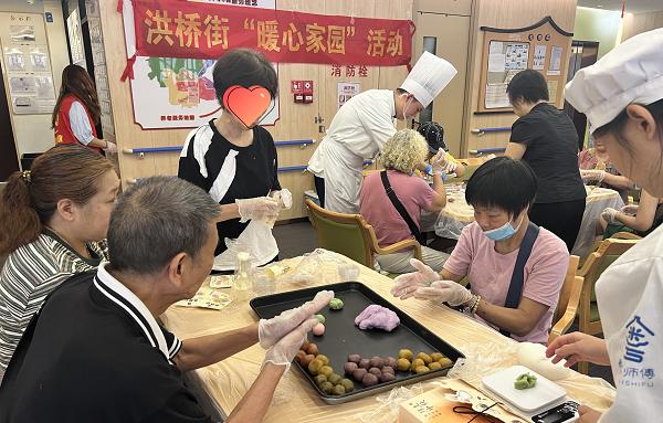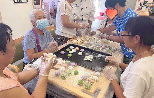 在掌握基本方法后,長者們分組動手實踐,稱重、和面、包餡、壓?!恳粋€步驟都認真投入。盡管不少人是初次嘗試,但在互相幫助與鼓勵下,一個個精致可口的月餅逐漸成型?;顒蝇F場笑語盈盈,暖意流動,長者們紛紛捧出親手制作的月餅,展示成果、合影留念,喜悅之情溢于言表。
