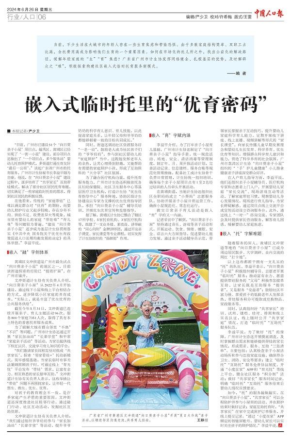 “目前,廣州市已建設(shè)51個‘向日葵親子小屋’項目點,越秀區(qū)、黃埔區(qū)已經(jīng)實現(xiàn)了‘一街一小屋’建設(shè),部分項目點還推出了‘一個項目點,多個服務(wù)站’嬰幼兒托育照護模式,多渠道打通生育友好‘最后一公里’?!闭勂饛V東省廣州市的托育服務(wù),廣州市計生協(xié)秘書長李益平頗為自豪。他說,在“向日葵親子小屋”建設(shè)過程中,逐步培育了“共享家長”互助帶娃模式,解決了部分社區(qū)居民托育難題,切實滿足了一些家庭臨時托育的需求,得到社區(qū)居民的積極反饋。